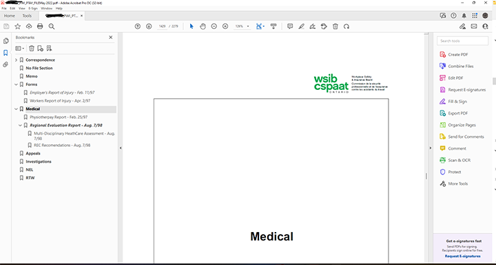 I have provided an example of my WSIB claim file and how I used the bookmarks feature to organize the file into sections and highlight important documents.